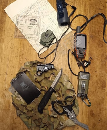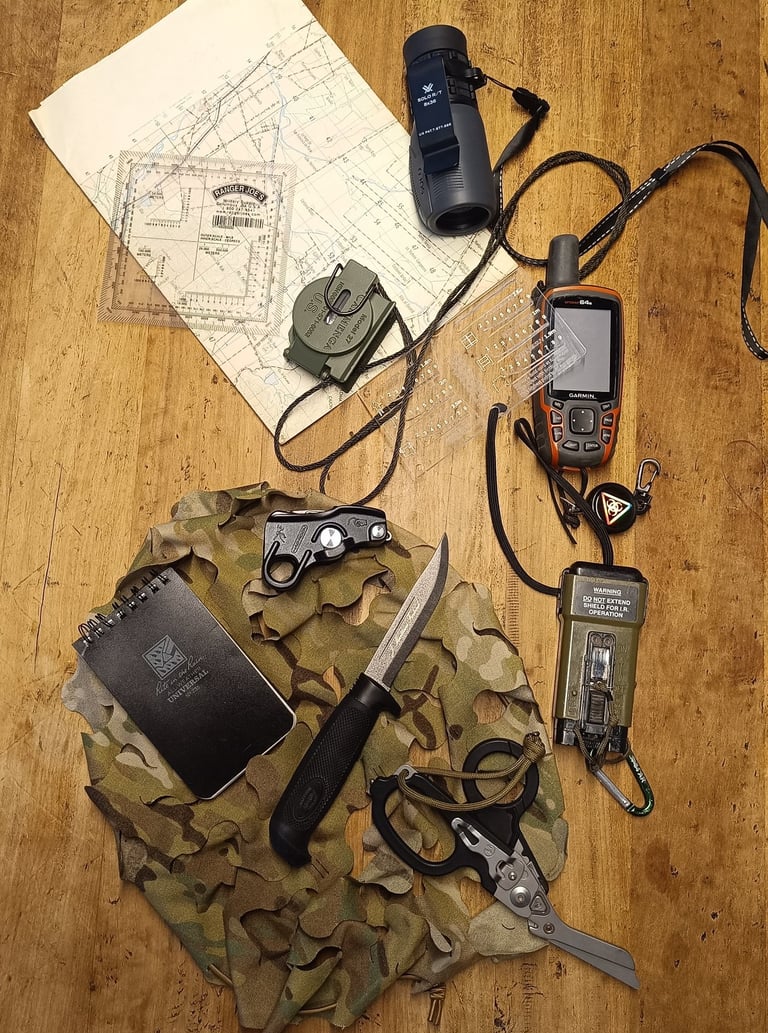 Brújula, GPS, hacha ó sierra plegable, multiherramientas, pilas de repuesto, arnés de pecho (chest rig), pala portátil, botiquín heridas menores, Bivy o carpa personal, Binoculares o telémetro.